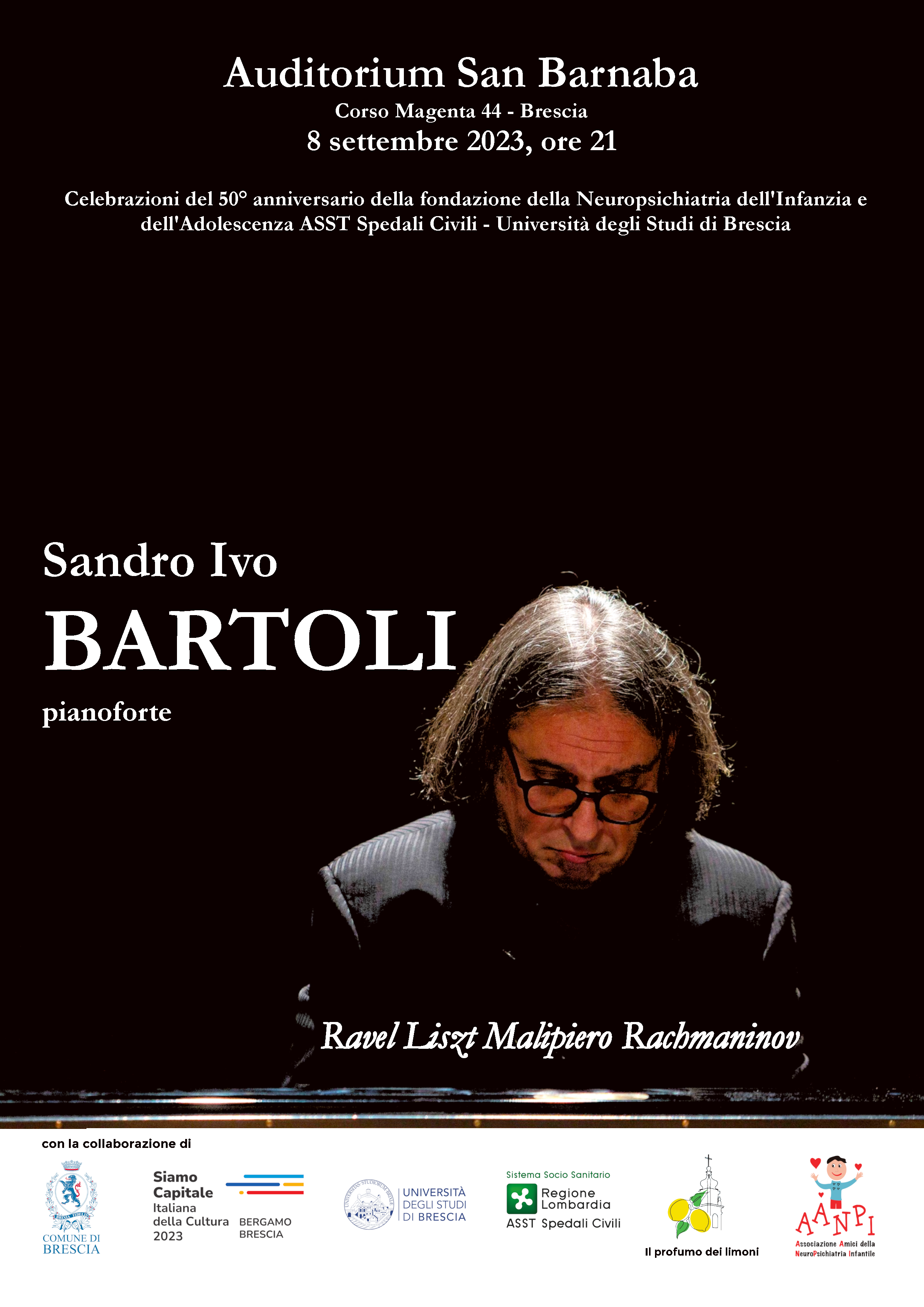 In occasione del 50mo anniversario della fondazione della Neuropsichiatria dell'Infanzia e dell'Adolescenza ASST Spedali Civili – Universitą degli Studi di Brescia, si terrą il giorno 8 settembre 2023 alle ore 21.00 presso l’Auditorium di San Barnaba il Concerto, per pianoforte, del Maestro Sandro Ivo Bartoli.
